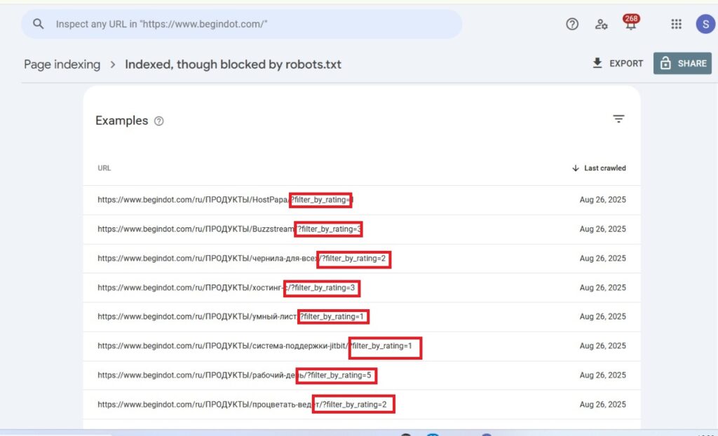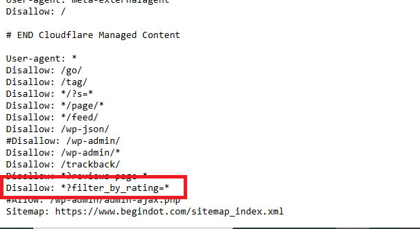 You or Someone added a rule in robots.txt: https://www.begindot.com/robots.txt to disallow any URL that contains ?filter_by_rating=